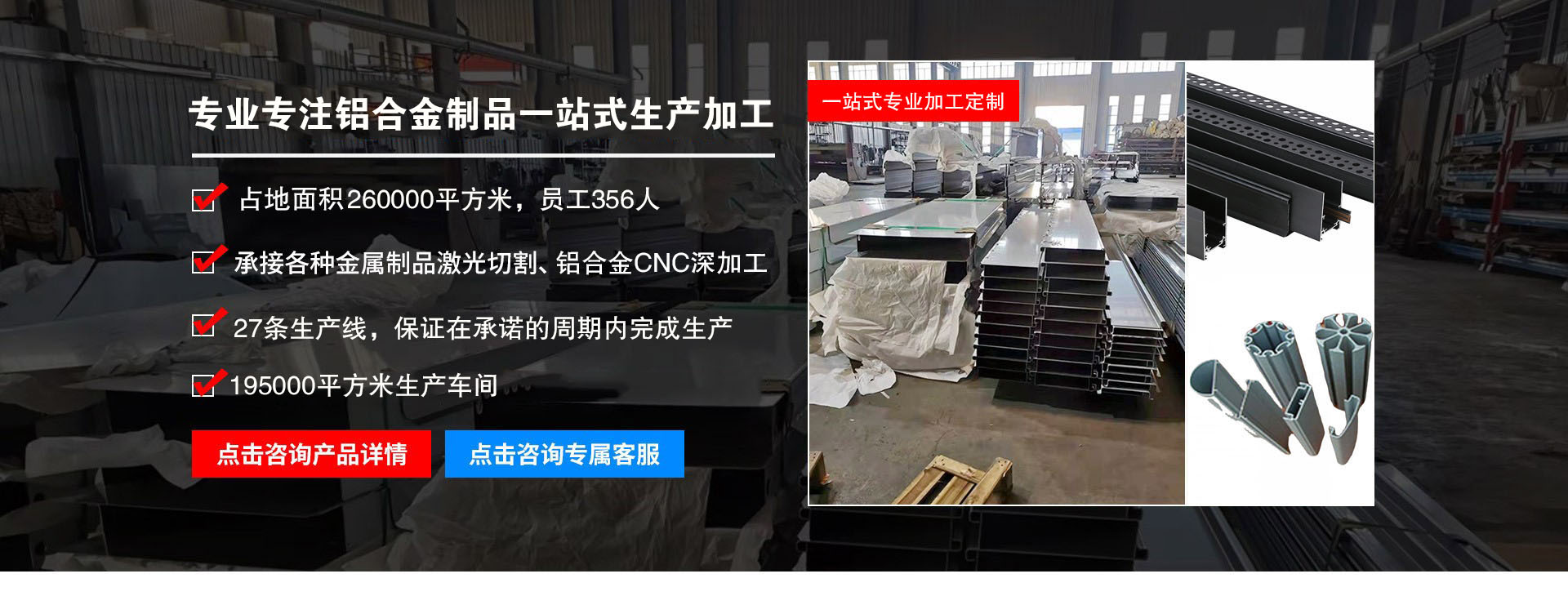 現擁有當今先進鋁加工生產設備配套齊全,其中: 擠壓車間機臺:4000 噸機 3000 噸機各 1 臺,1000 噸 機 1200 噸機 800 噸機各 2 臺,600 噸機 7 臺。模具生 產 2 個車間,熔鑄生產線 5 條爐,氧化生產線. 電泳生 產線.噴涂生產線及CNC深加工加工車間。意聯金屬制品有限公司不但擁 有先進的設備和科學的技術,而且擁有一批優秀的企業精英,我們不斷創新,不懈追求更完美的產品,依靠先進的設備和科學的現代化管理,我司的產品暢銷全國各地和出口美國.加拿大.澳大利亞. 中國香港地區. 中國澳門地區等國家和地區。